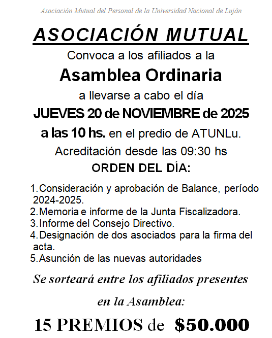 Se convoca a los afiliados a la Asamblea Extraordinaria a llevarse a cabo el miércoles 12 de abril de 2017 a las 10 hs. en el salón Auditorio de la UNLu, Ruta 5 y Avda. Constitución de la ciudad de Luján.